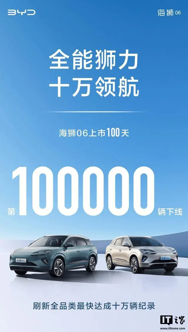 10 月 31 日消息,比亚迪宣布旗下海狮 06 上市 100 天,迎来第 10 万辆车下线,刷新旗下“全品类最快达成 10 万辆纪录”。