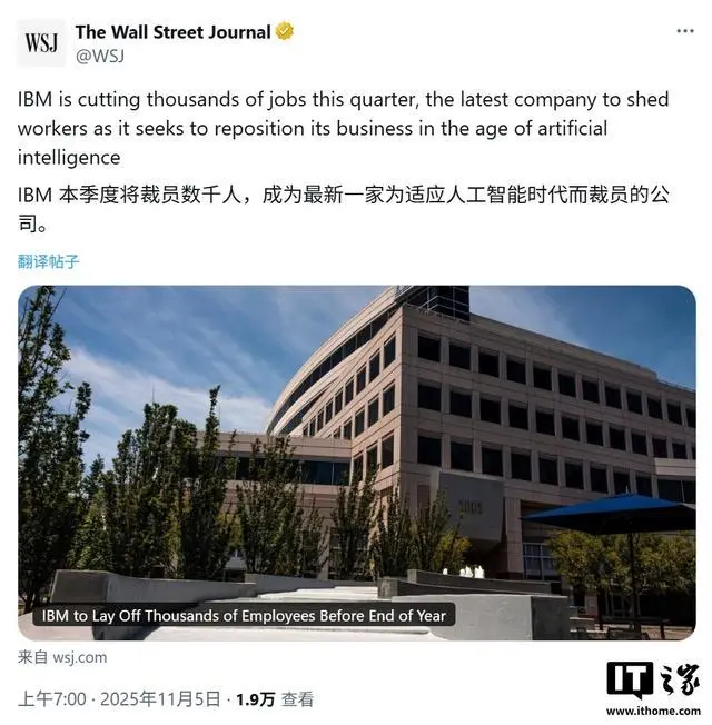 11 月 5 日消息,媒体 CNBC 昨日(11 月 4 日)发布博文,报道称 IBM 将在 2025 年第 4 季度进行新一轮裁员,预计波及员工数量,在全球员工总数的占比为“较低的个位数”(low single-digit percentage)。