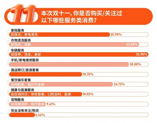 在具体的品类关注分布上,个人护理用品与家庭清洁用品并列成为最受关注的细分品类,食品类紧随其后,纸品、饮品等基础消耗品也保持着较高的关注度。与此同时,服务类消费正逐步从「可选」走向「刚需」。家政服务、家电清洗、维修护理等正被越来越多家庭视为解决家务难题、维持高效运转的优先方案或标配。在双 11 期间,高达 93.34% 的受访者表示已关注或购买服务类商品,显示出服务消费已 融入家庭生活场景,成为不可或缺的组成部分。这种转变的核心原因在于当代家庭对「时间价值」的日益重视,通过购买专业服务解放时间,换取生活品质与心理舒适。