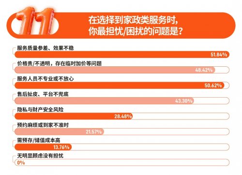 然而,服务质量参差、价格不透明仍是制约服务消费发展的核心痛点。在家政服务中,超半数消费者担忧服务质量与人员专业性;在家电清洗和维修服务中,服务质量差与价格问题同样突出。同时,「平台监管弱,出了问题投诉无门」与「售后扯皮、平台不兜底」也是消费者的重要顾虑,反映出部分服务平台在标准化、专业化及信任机制方面仍存在系统性问题。这些痛点共同构成了消费者在选择服务时的心理障碍,也预示着未来哪家平台能率先解决这些问题,就将在「品质竞争」时代占据先机。