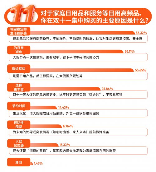 调研还分析了消费者在购买家庭用品和服务时的深层动机,「巩固生活秩序感」以 56.32% 的占比成为首要驱动力,「低价」与「减轻生活负担」紧随其后,三大动机的选择率均超过 50%,它们相互叠加而非彼此替代,共同构成了家庭消费的决策基础。这表明,在不确定性上升的环境下,消费者通过掌控日常生活必需品和常备家庭服务来提升生活的掌控感与安全感。