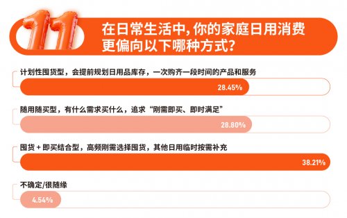 近四成消费者选择了「囤货+即买结合」的灵活模式,他们采取高频刚需用品集中囤货,其他日用品临时按需补充的策略,既能享受大促的价格优势,又能保持一定的灵活性,这体现了当代消费者的成熟与理性。