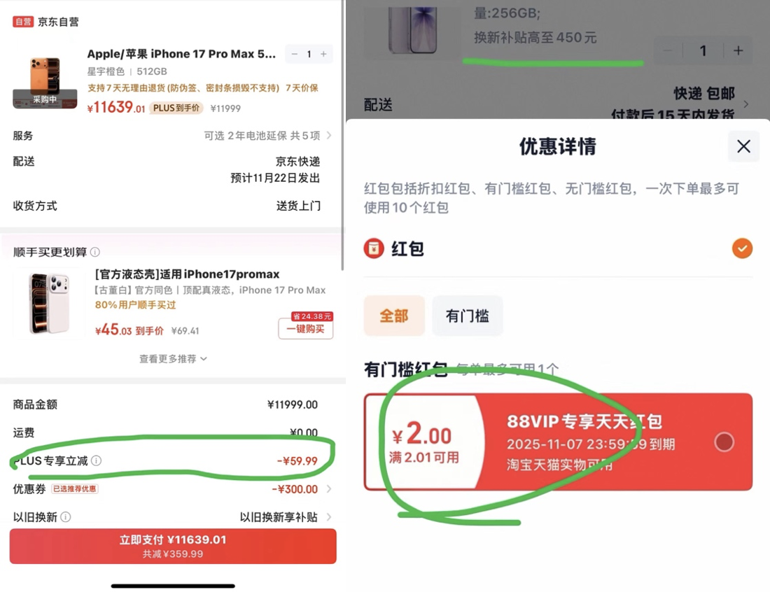 一年一度的双十一已经到了最后的冲刺阶段,大家都低价买到iPhone 17系列了吗?为了让没买到iPhone 17系列的果粉能放心入手,各大正品平台都拿出了自身优惠,但还是有些许区别的。近日就有网友对比了天猫和京东的优惠力度,发现京东PLUS会员比天猫88VIP多补30倍。