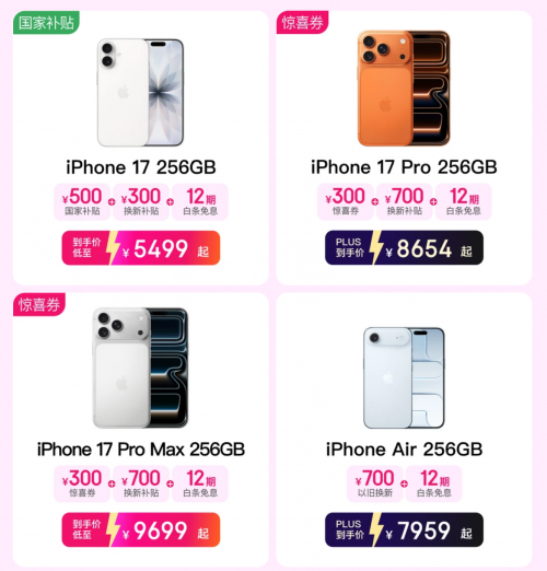 相比天猫,256G版iPhone 17京东国补覆盖范围增加到了12个,比天猫多4个;iPhone 17 Pro系列除了300元惊喜券外,京东还提供700元的以旧换新补贴,以旧换新还能再便宜700元,在价格层面完胜天猫。