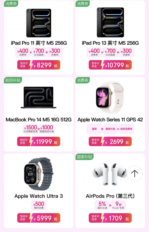 iPad Pro、MacBook Pro新品同样有优惠,新品均搭载Apple M5芯片,性能上实现大幅提升,对于想升级生产力工具的小伙伴,可以入手。11月9日晚8点来京东,iPad Pro M5新品可使用400元消费券,叠加700元以旧换新补贴、300元优惠券,11英寸256G版到手价低至8299元起,13英寸256G版到手价低至10799元起;MacBook Pro 14 16+512G版,以旧换新至高补贴1500元,可叠加限量政府补贴1000元,到手价低至11999元起。这一优惠力度,无疑大大降低了用户的购买成本,让更多人能够体验到MacBook Pro新品带来的强大性能和卓越体验,助力用户在创作和专业领域中更加得心应手,高效完成各项任务。