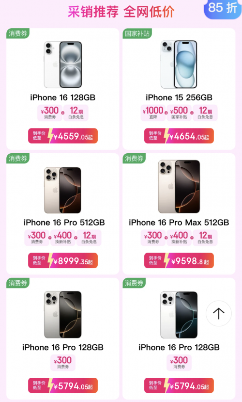 除了iPhone 17系列产品有优惠外,想换新iPhone上代产品的果粉也有福利。iPhone 16 128G版,可使用300元消费券,到手价低至4559.05元;iPhone 15 256G版,限时直降1000元,还能叠加国家补贴500元,到手价低至4654.05元;iPhone 16 Pro 512G版,可使用300元消费券,再叠加以旧换新补贴400元,到手价低至8999.35元。而且,以上机型同样均可支持12期免息,部分产品PLUS会员还有专享立减优惠,到手价格更低。