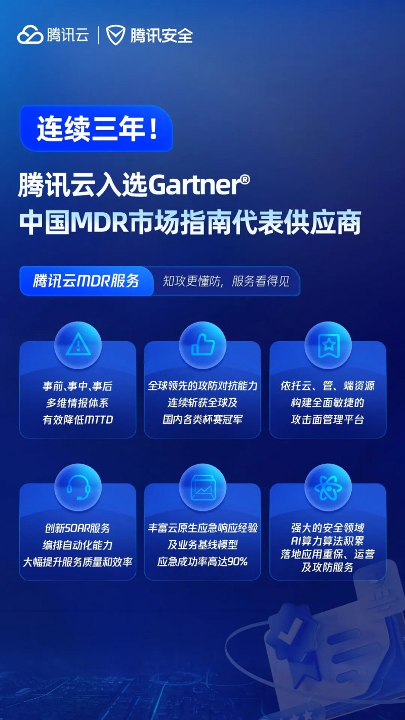 近日,Gartner®发布“Market Guide for Managed Detection and Response Services, China”报告(以下简称“报告”),腾讯云凭借其MDR服务,被列为中国区MDR市场代表供应商,这也是腾讯云连续三年入选该系列报告。