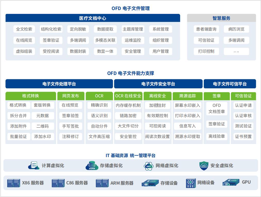 深信服与佐医佑康联合推出的OFD文档集中管理平台一体机解决方案,精准切入这一痛点。方案以国家标准的OFD(Open Fixed-layout Document)版式文件格式为核心技术载体, 融合国密算法、数字签名、可信空间建设等前沿安全技术,旨在为医院构建一个贯穿电子文件全生命周期的统一、安全、可信的管理与应用体系,不仅确保电子文件的长期可读、可存、可信、可用,更为其在多元场景下的高效流转与 应用注入强劲动能,全面支撑医疗机构的数字化转型升级。
