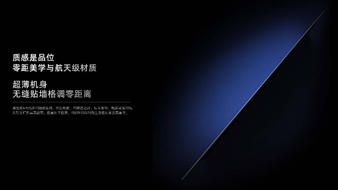R10观感系列不仅在功能上追求松弛,更在外观设计上实现美学与实用的统一,让电视成为家居风格的加分项。其采用四等边设计与纯平美背,机身厚度较传统电视减薄20%,以≤60mm的超薄尺寸实现无缝贴墙效果。相较于普通艺术电视>120mm的“厚重小书包”机身,R10彻底打破了设备与墙面的视觉割裂感,无论是现代简约风还是轻奢风家居,都能自然融入,营造电视即装饰的格调。机身选用航天级钛合金材质,集优质、美观、耐用于一体,每一块面板、每一条线条都彰显高级感。内部搭载航发级涵道散热系统,既保障设备长期稳定运行,又能有效省能省耗,兼顾颜值与实用性,让用户无需担心设备易损坏、能耗高等问题,进一步强化使用松弛感。