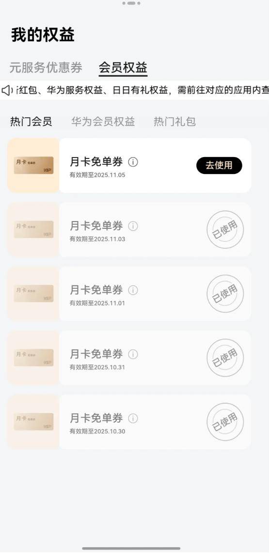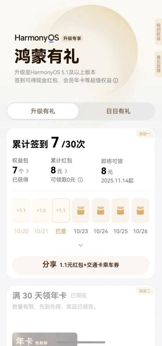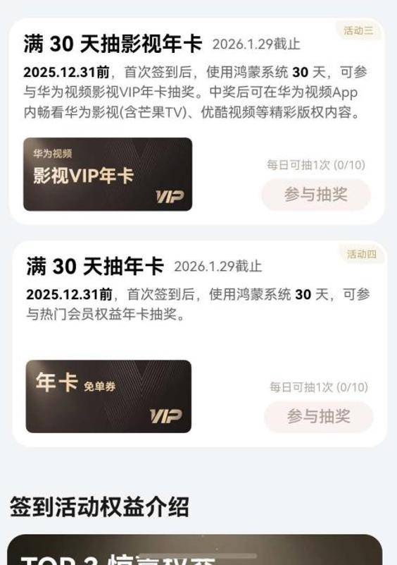 最关键的是,我本以为,这每天签到领福利的活动持续30天,我的“羊毛之旅”就差不多了。结果前两天点进去一看,鸿蒙有礼又上新活动了:抽年卡免单券!