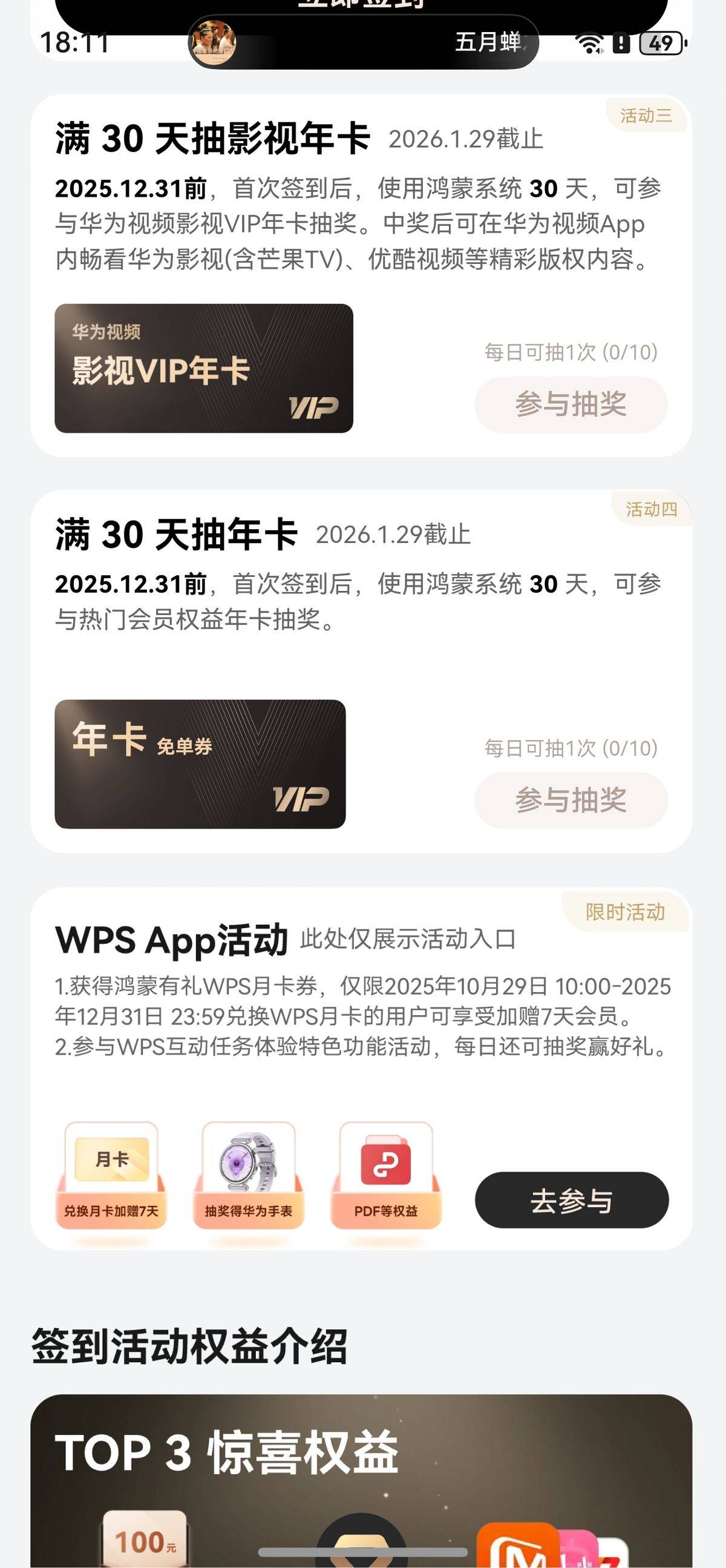 当然,“鸿蒙有礼”的羊毛不止这些。首次签到第30天后,还能去参与抽年卡的活动!这要是抽中了,就能兑换B站、优酷视频等热门应用的会员年卡,未来一年的追剧钱都省了,这不又给双十一回血了么?