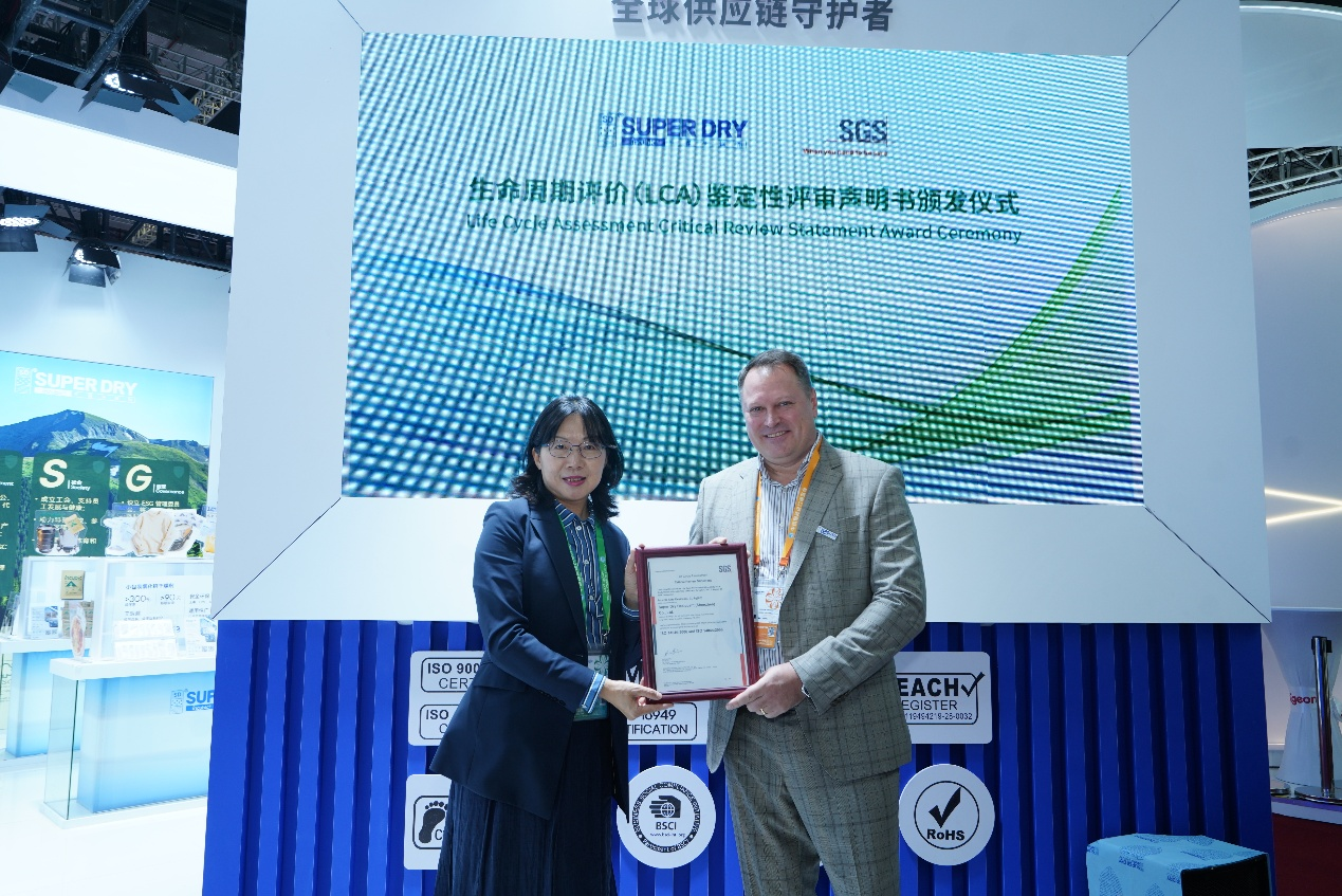 11月6日,SUPER DRY干霸展台迎来开展以来的首个高潮——“SUPER DRY三款核心产品LCA(生命周期评价)评审声明颁证仪式”隆重举行。国际权威认证机构SGS代表亲临展台,向SUPER DRY干霸颁发LCA评审声明书,并与干霸管理层展开交流。这份声明的发布,不仅是一次技术实力的展示,更是SUPER DRY干霸向每一位客户、向社会、向未来立下的绿色承诺。