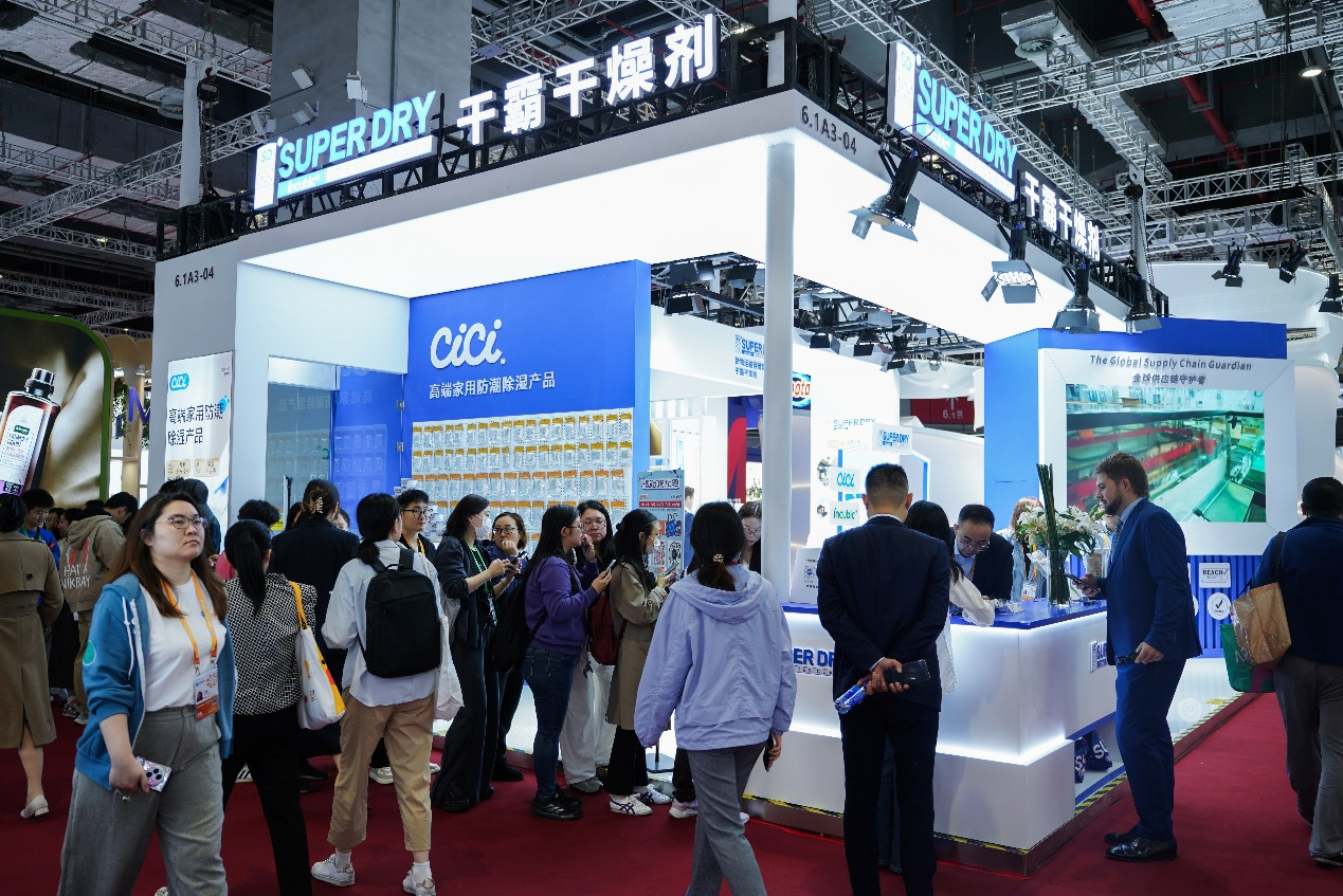 此次参展,SUPER DRY干霸携旗下核心产品矩阵实力亮相,包括集装箱氯化钙干燥剂、小包装氯化钙干燥剂、矿物干燥剂、氯化镁干燥剂、脱氧剂、以及CICI家用除湿系列等产品。从货物远洋运输的全程防护,到高端电子产品的精密防潮;从家居场景的防潮除湿,到食品、药品的长期保鲜,SUPER DRY干霸不仅展现了其在专业领域的技术实力,更吸引了大量专业买家和终端消费者的驻足咨询。