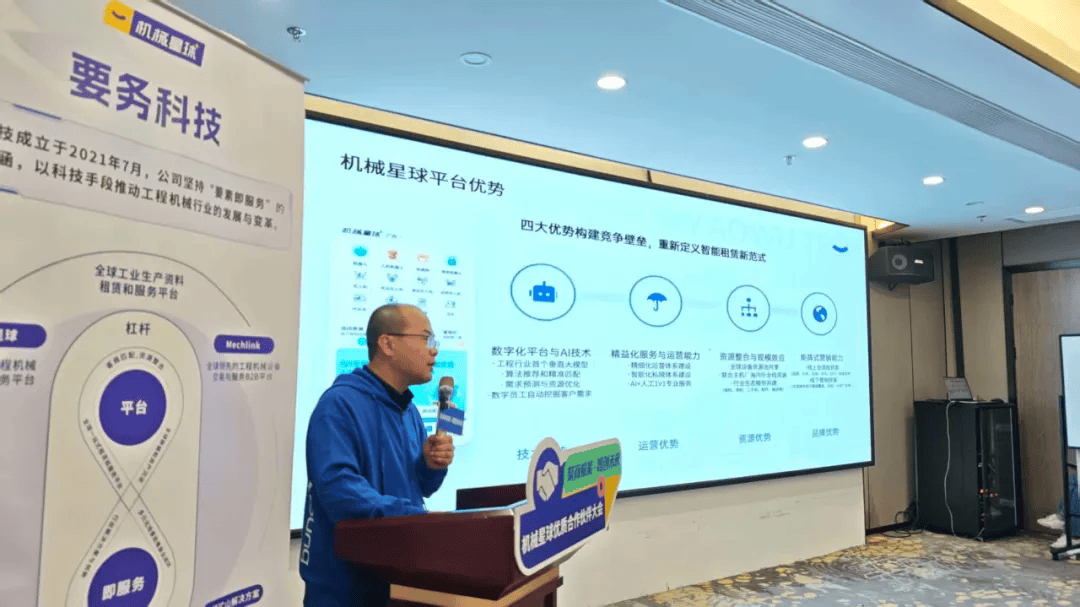 11月6日,大会正式启幕。要务科技副总裁陈孟斌率先登台,详细解读了公司三大核心业务板块 —— 即服务、平台及 AI 创新中心。作为平台核心支柱的机械星球,致力于打造全国领先的工业生产资料租赁和服务平台,其核心价值就是精准链接行业供需双方,搭建高效协同的合作桥梁。