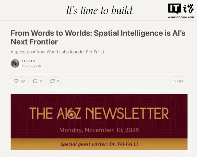 11 月 11 日消息,11 月 10 日,斯坦福大学教授、WorldLabs 联合创始人李飞飞发表长文《From Words to Worlds: Spatial Intelligence is AI’s Next Frontier(从文字到世界:空间智能是 AI 的下一个前沿)》。