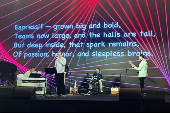 乐鑫年会上的工程师乐队,歌词大意:团队日益庞大,大楼高耸,但内心深处,依然充满激情、荣耀与不眠的大脑。