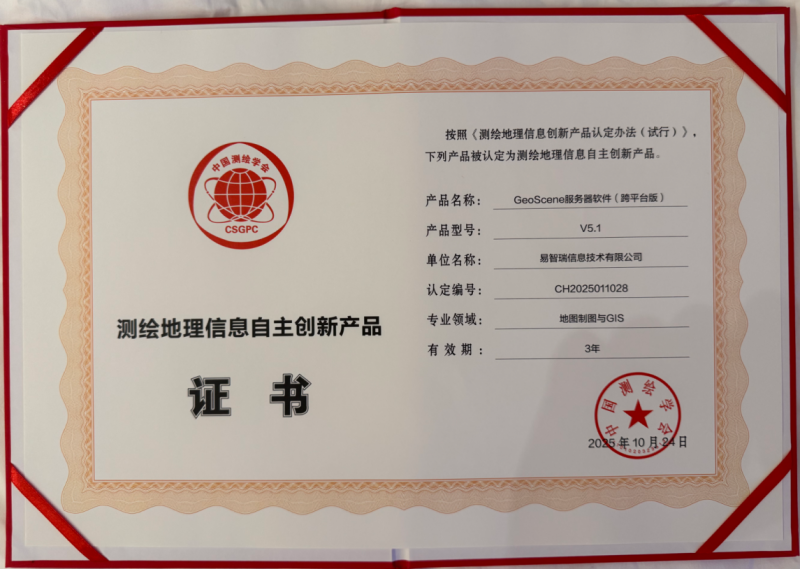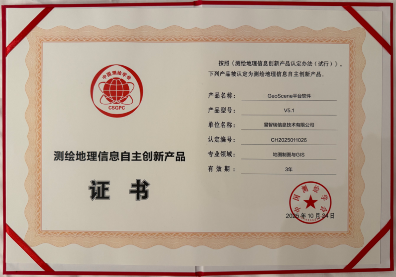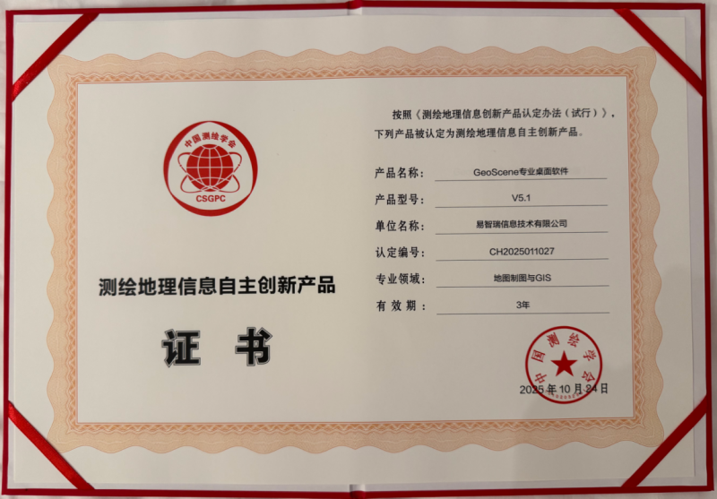 11月5日至7日,第二届中国测绘地理信息大会在浙江德清举办,经《测绘地理信息创新产品认定办法(试行)》,易智瑞信息技术有限公司自主研发的GeoScene平台软件V5.1、GeoScene专业桌面软件V5.1、GeoScene服务器软件(跨平台版)V5.1,被认定为测绘地理信息自主创新产品。