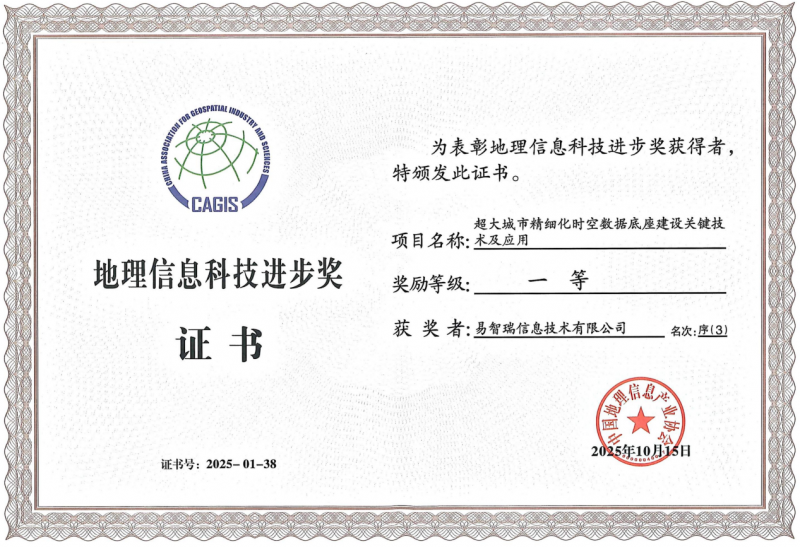 同时,易智瑞公司与上海市大数据中心、北京大学等单位联合完成的 “超大城市精细化时空数据底座建设关键技术及应用”项目成果,荣获2025地理信息科技进步奖一等奖。