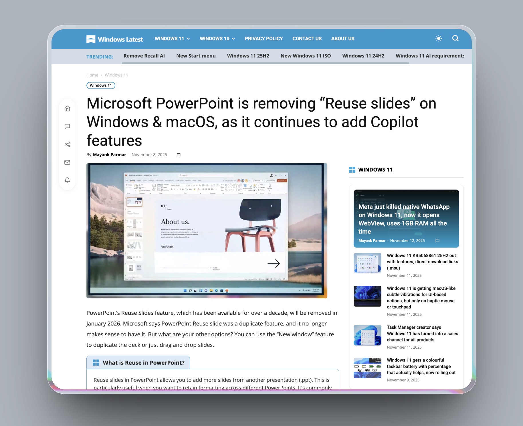 微软近日宣布,将在 2026 年正式移除 PowerPoint 中的“重用幻灯片”功能。这一功能曾帮助职场人从旧文件中快速提取内容、拼接新PPT,被称为“复用神器”。消息一出,不少用户在社交媒体上表示惋惜,认为这是一次对实用工具的收缩。