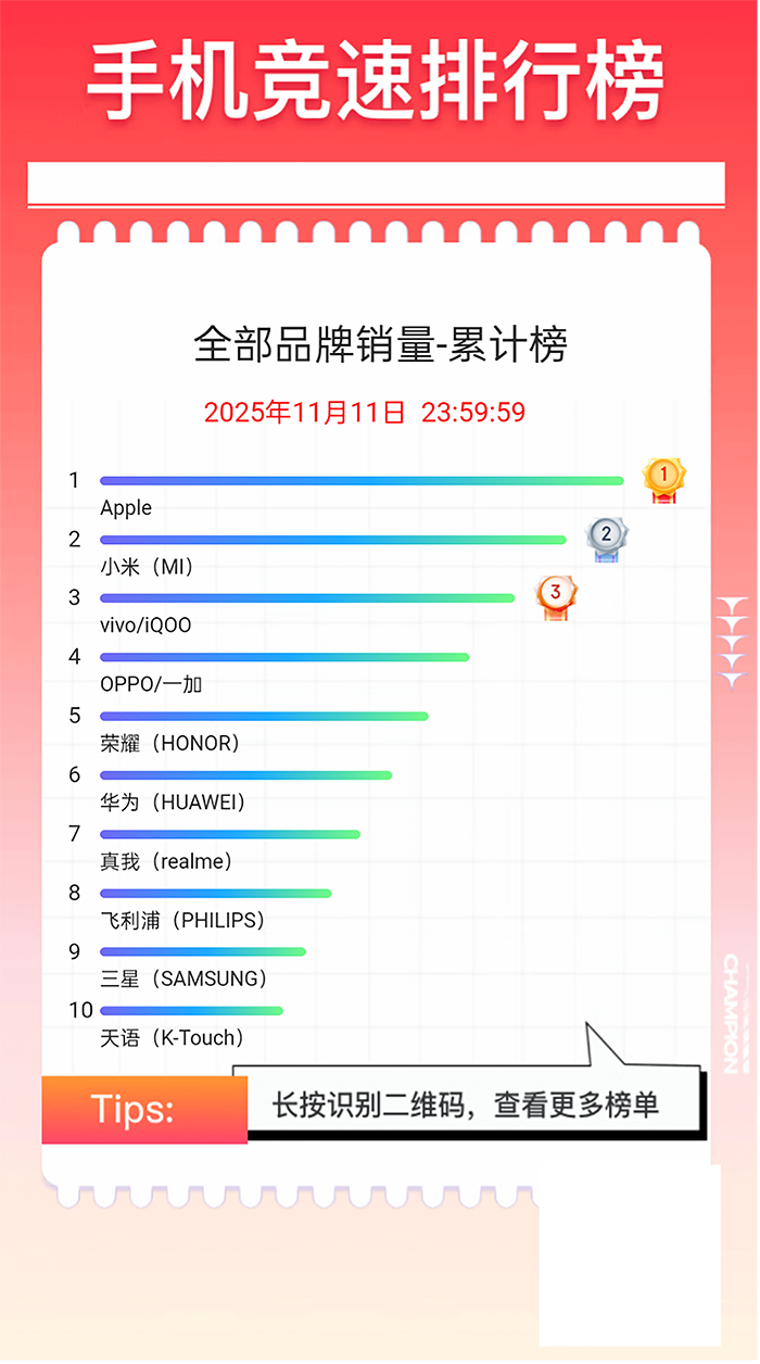 京东11.11圆满收官,众多消费者享受到了“又好又便宜”的商品和服务,手机产品销量增长显著。京东数据显示,成交额破亿的手机单品超60款;手机新品成交额同比增长超4倍。京东11.11推出手机竞速榜,根据手机产品销量实时更新,各大手机品牌竞争激烈。下面来看看整个京东11.11全周期各大品牌的热销情况吧。