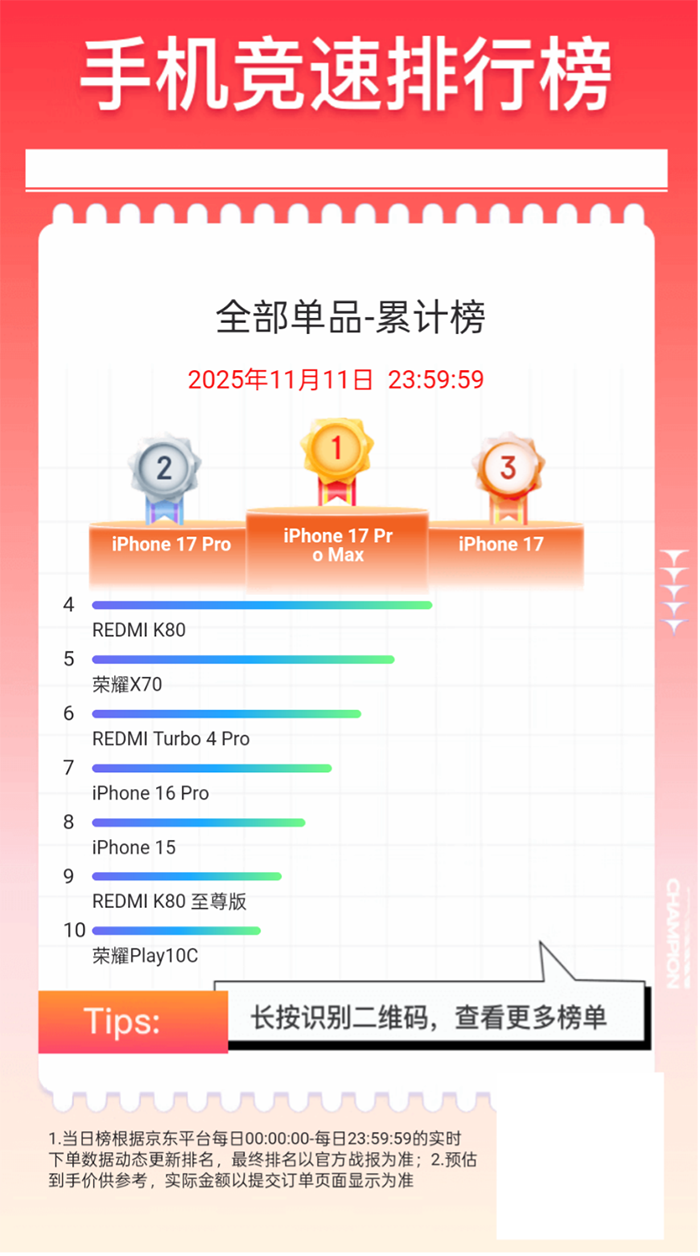 在京东11.11全部单品累计榜中,iPhone 17 Pro Max、iPhone 17 Pro与iPhone 17包揽前三,iPhone 16 Pro、iPhone 15也进入前十,iPhone竞争力仍旧在线。REDMI表现亮眼,REDMI K80、REDMI Turbo 4 Pro、REDMI K80至尊版三款机型上榜,进入全部单品累计榜前十。