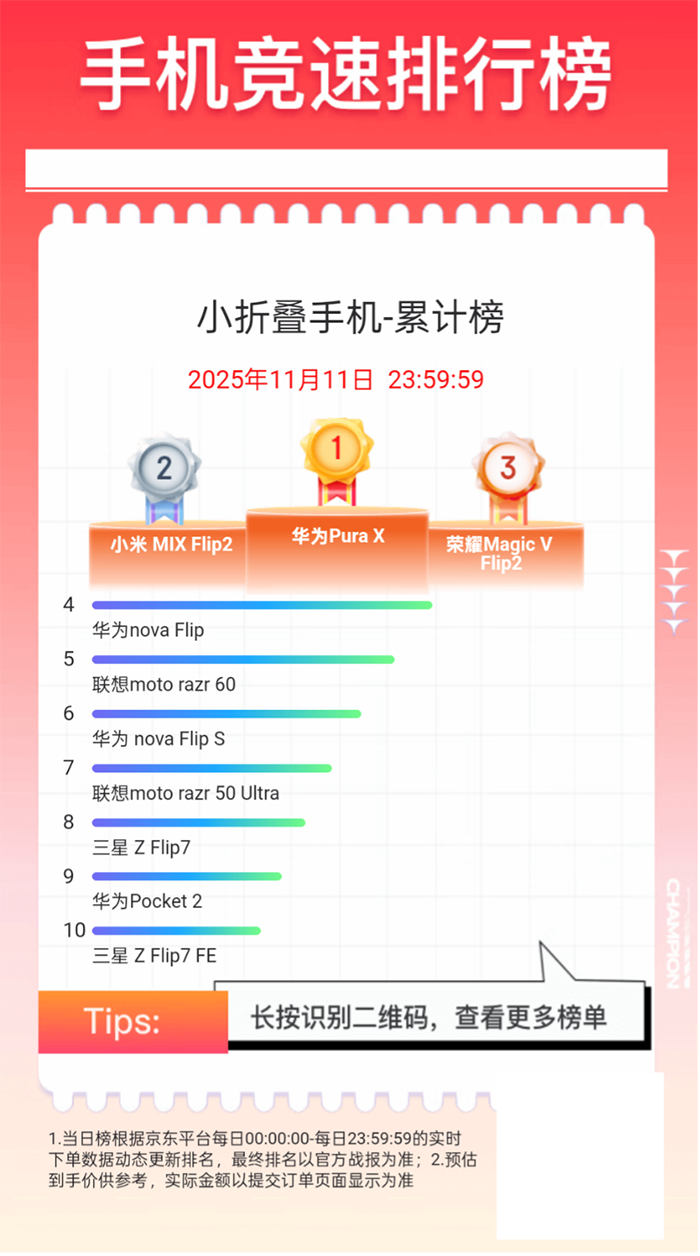 在京东11.11小折叠屏手机累计榜中,华为Pura X、小米MIX Flip2、荣耀Magic V Flip2位列前三。值得关注的是,在小折叠屏前十中,华为品牌手机占据四个位置;联想moto razr 50 Ultra和联想moto razr 60也进入小折叠屏手机累计榜前十。
