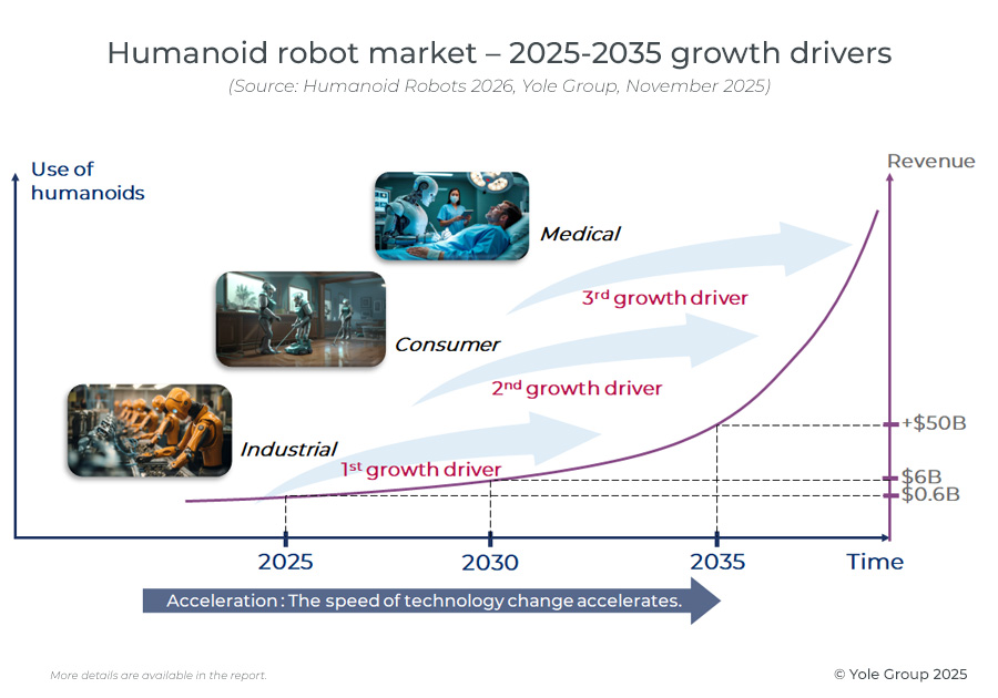 Yole预估,2035年全球人形机器人市场规模将增至510亿美元,年复合增长率达55%,呈现高增长态势。未来五年,工业领域将成为人形机器人市场应用的首个爆发领域,增长空间显著。