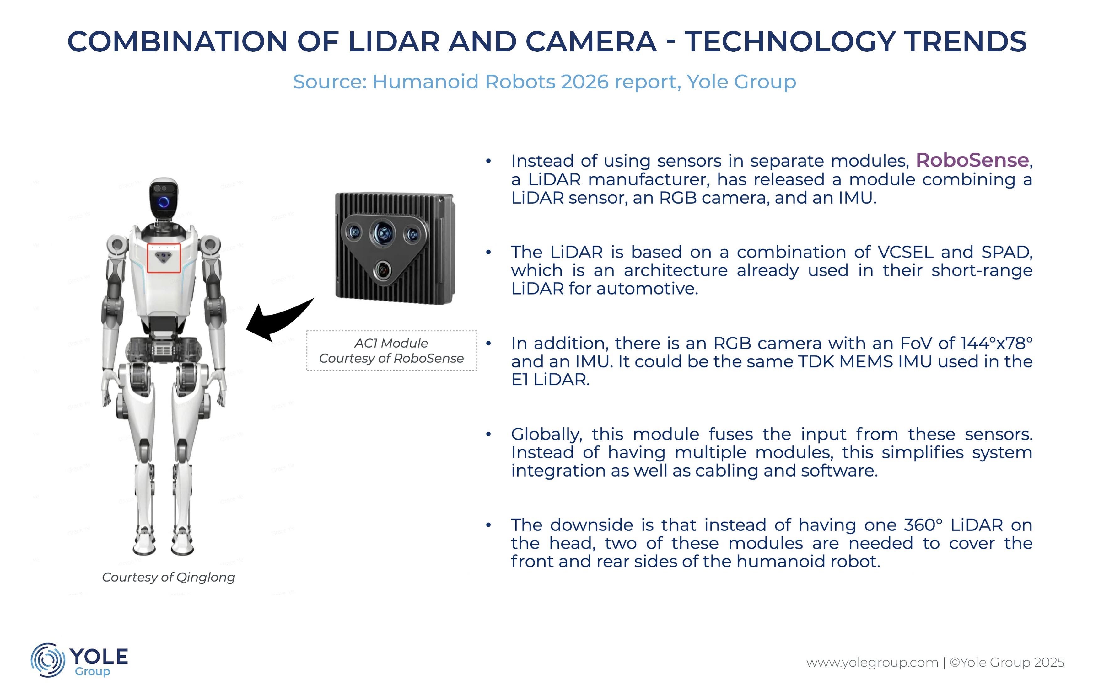 报告选取RoboSense“机器人之眼”作为技术趋势代表案例。Yole Group认为,与多个独立感知模块相比,AC1硬件级集成的激光雷达+RGB相机+IMU的一体化感知方案,不仅简化了系统集成,也在软件适配、布线等方面更加简洁高效。