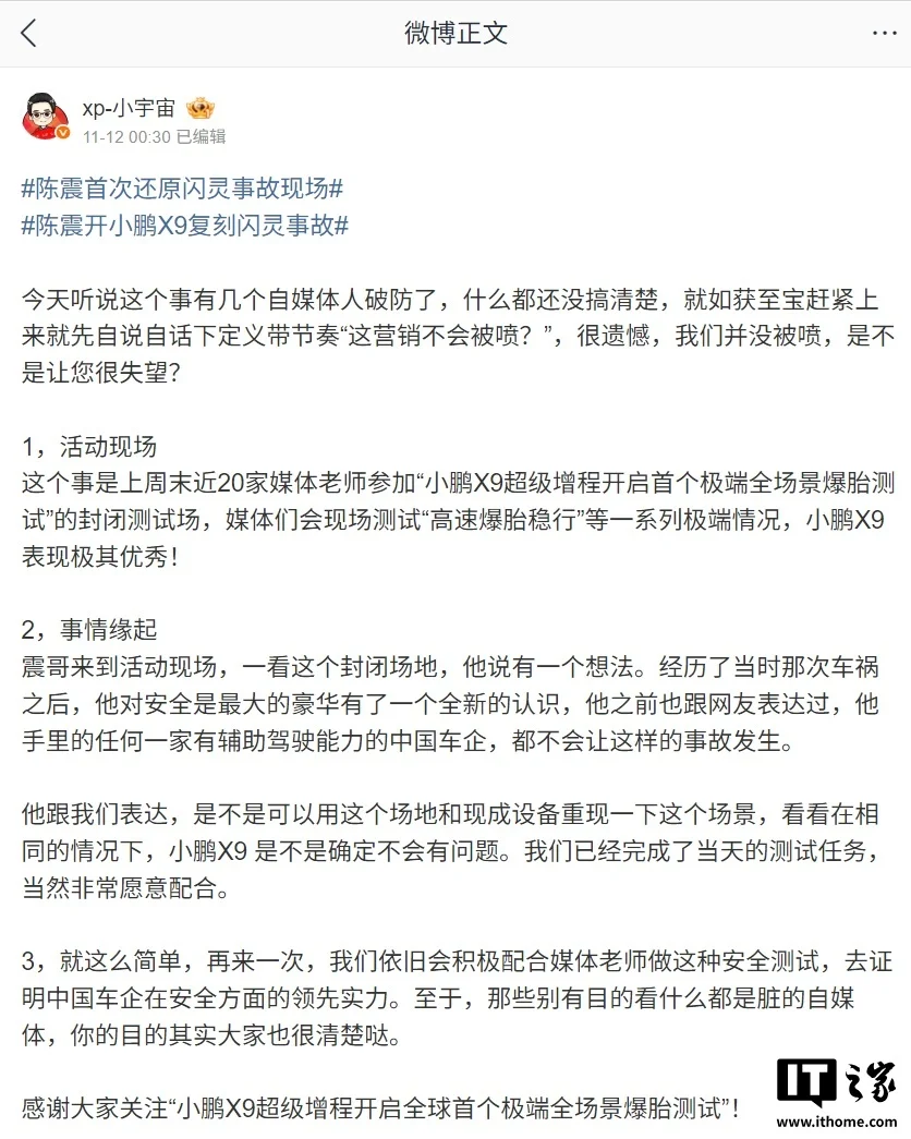 小鹏 员工 @xp-小宇宙 11 月 12 日凌晨发文回应称: