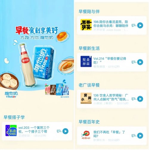 为将理念 植入消费者生活,维他奶构建早餐场景媒介矩阵。早餐时段,在爱奇艺、优酷等视频平台投放贴片广告;在公交站牌和楼宇媒体高密度投放,覆盖通勤族出行路径。同时,与小宇宙APP合作,植入五档热门播客节目,主播分享早餐搭配维他奶的日常故事,引发情感共鸣并口播优惠券信息,引导购买。