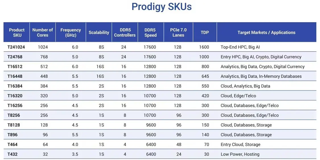 其中最高等级的 Prodigy Ultimate 提供 768 / 1024 个内核、24 个 DDR5 内存通道;Prodigy Premium 拥有 256~512 个内核、16 个 DDR5 内存通道;入门级 Prodigy 则至多 128 个内核、4/8 个 DDR5 内存通道。