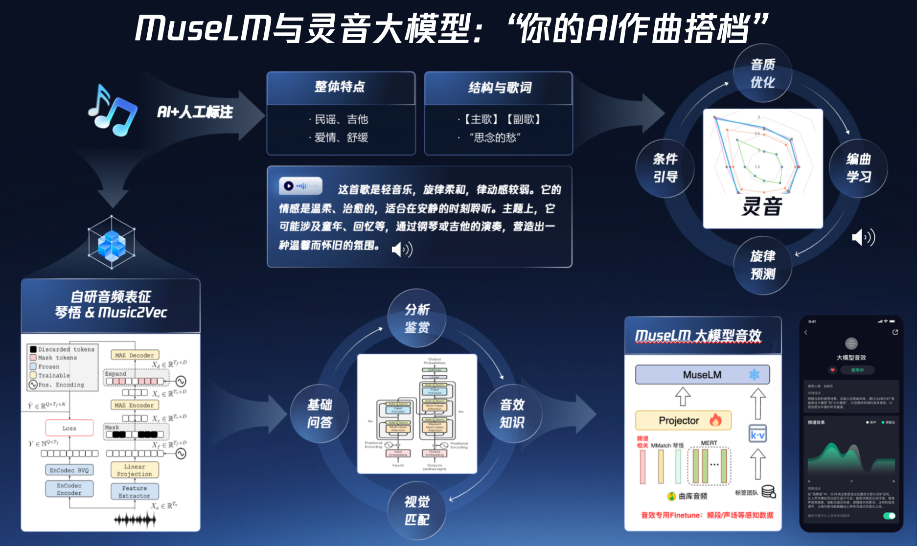 该方案集成了TME天琴实验室的核心音频AI能力,包括“琴语AI播客”、“灵音大模型”、“MuseLM音乐大语言模型”和“琴语有声书”模块,涵盖了智能播客生成、音乐内容理解与生成、文本转音频等多个关键场景,构建起覆盖内容生产全链路的AI能力体系。