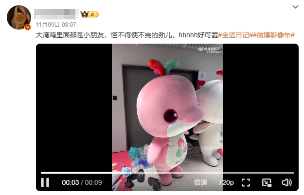 而在“大湾鸡”皮囊之下,都是一群似乎使不完劲的小朋友,凭借自己的活力和对全运会的热爱,塑造出一个个活泼喜人的“大湾鸡”形象。