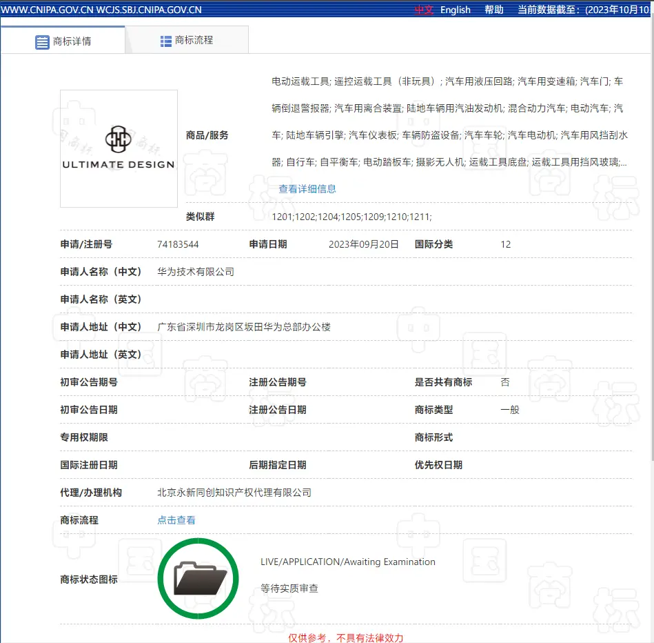 IT之家查询获悉,早在 2023 年,华为技术有限公司就已经申请类别为“运输工具”的“ULTIMATE DESIGN”(非凡大师)商标。