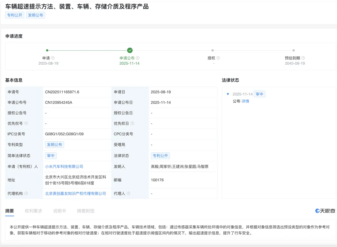 11月14日,天眼查显示,近日,小米 科技有限公司申请的“车辆超速提示方法、装置、车辆、存储介质及程序产品”专利公布。摘要显示,本公开涉及车辆技术领域,包括:通过传感器采集车辆所处环境中的对象信息,并根据对象信息筛选出预设类型的对象作为参考对象,获取车辆相对于移动的参考对象的相对行驶速度;在相对行驶速度处于超速提示阈值区间内的情况下,输出超速提示信息,提升了行车安全。