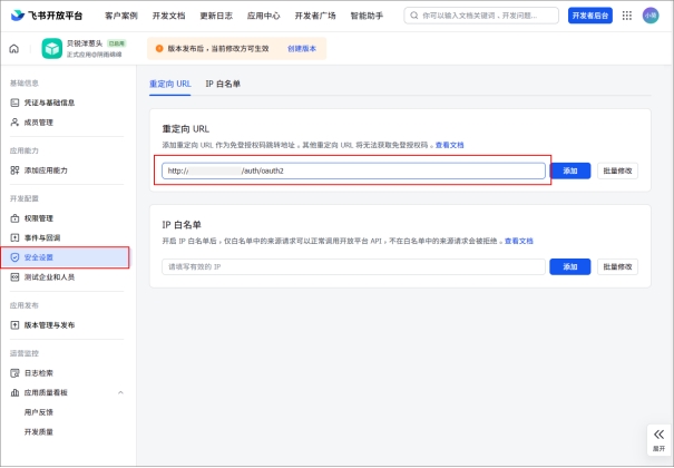 点击【安全设置】,在重定向URL中填写:协议头://域名/auth/oauth2,其中协议头和域名与私有化部署时填入的信息保持一致。