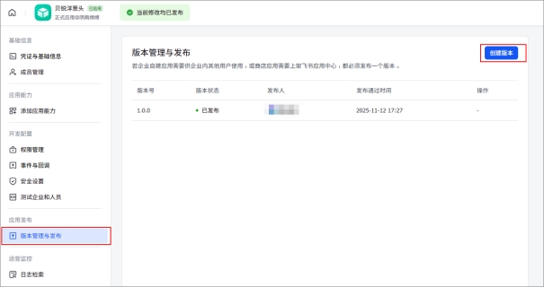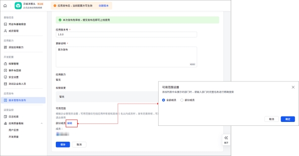 点击【版本管理与发布】-【创建版本】,可用范围中需要选择“全部成员”。若希望仅同步一部分组织架构的数据,则按需选择。