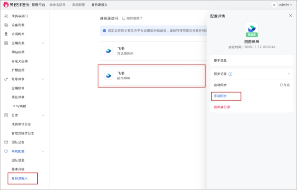 访问洋葱头管理平台,点击【系统配置】-【身份源接入】,选择身份源,在侧边抽屉中点击【手动同步】,即可全量同步此身份源的组织架构。
