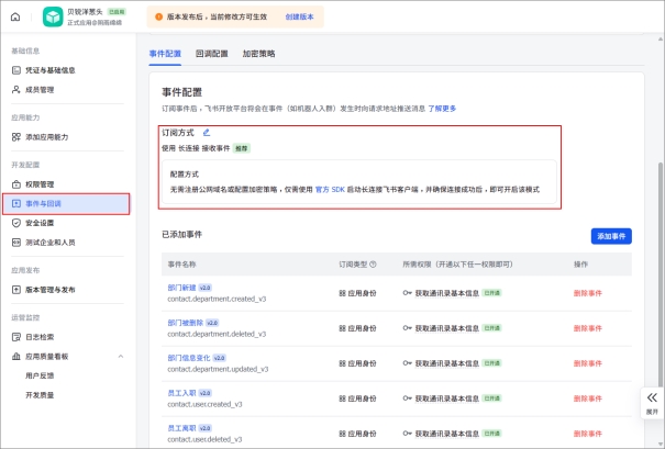 (1)请前往飞书开发者管理后台,选择对应的自建应用,点击【事件与回调】-【事件配置】