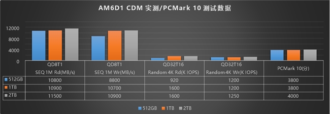 CDM实测验证,AM6D1在QD8T1与QD32T16等典型场景下的顺序读写与随机读写性能均优于标称值。在PCMark 10测试中,该产品512G与1TB版本得分均达3800分,2TB版本更达到4000分,充分展现了其卓越的综合读写性能。