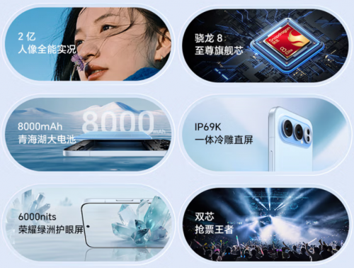 荣耀500 Pro搭载骁龙8至尊旗舰芯,内置8000mAh青海湖电池,支持80W有线超级快充、50W无线超级快充、27W有线反向快充;配置荣耀自研射频增强芯片C1+,网络更稳定。荣耀500 Pro采用6000nits高亮阳光屏,配置九大护眼科技,获得德国莱茵无频闪、全局护眼认证。荣耀500 Pro后置2亿像素AI超清主摄、112°超广角微距镜头、5000万长焦人像镜头,配置CIPA 5.0防抖大底;支持AI长焦,远方也清晰。