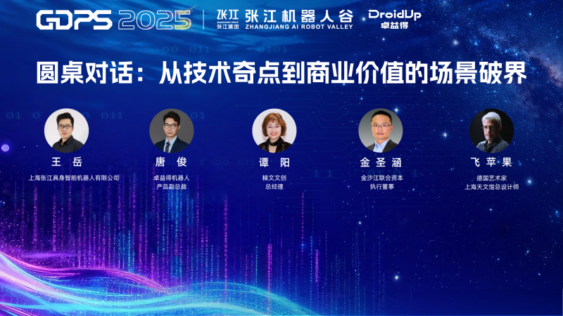 圆桌论坛环节,由上海张江具身智能机器人有限公司王岳主持,卓益得产品副总裁唐俊、精文文创总经理谭阳、金沙江 执行董事金圣涵等嘉宾围绕产业趋势、技术方向、场景落地及资本赋能展开 对话。