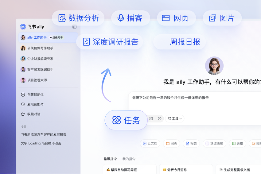 aily 工作助手是飞书 aily 面向工作场景提供的开箱即用的企业级智能体。在全新的任务模式下,aily 工作助手可以处理诸如“分析制造行业 3 家头部公司的发展策略并生成详细报告” “抓取 ProductHunt 前 100 热门产品并生成多维表格” 、“基于我的飞书云文档、任务及会议纪要,生成周工作总结报告”以及“为我的新产品生成官方网页” 等请求。aily 工作助手将智能地拆解复杂任务,灵活地在推理与操作之间切换,调用各类工具、编写代码,确保最终交付物的专业性与准确性。