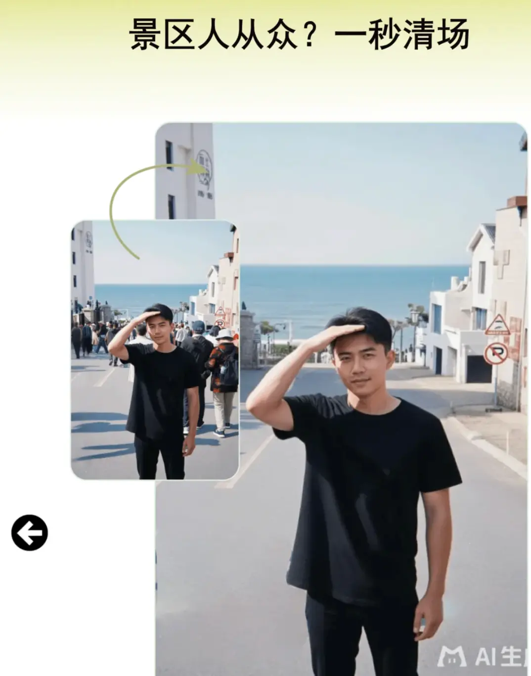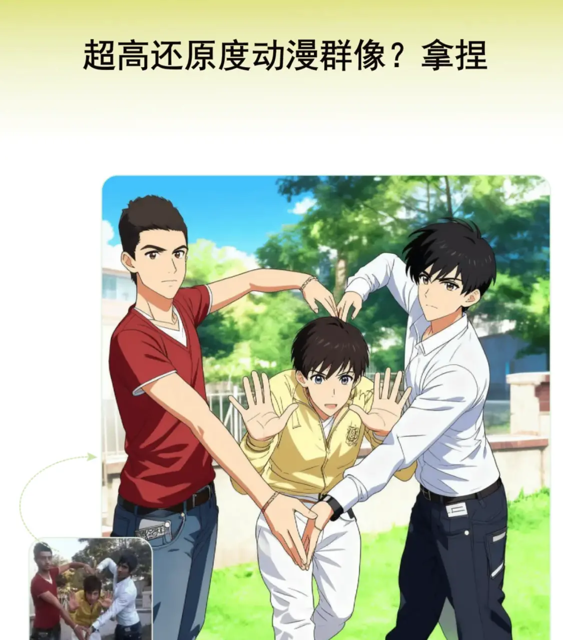 在新功能中,对话作图不仅支持文生图、图生图,还新增智能P图服务,可实现动漫群像还原、景区路人消除、同一场景切换春夏秋冬四季效果,并支持生成含多文字内容的海报,显著提升了用户在创意表达与日常修图方面的效率。