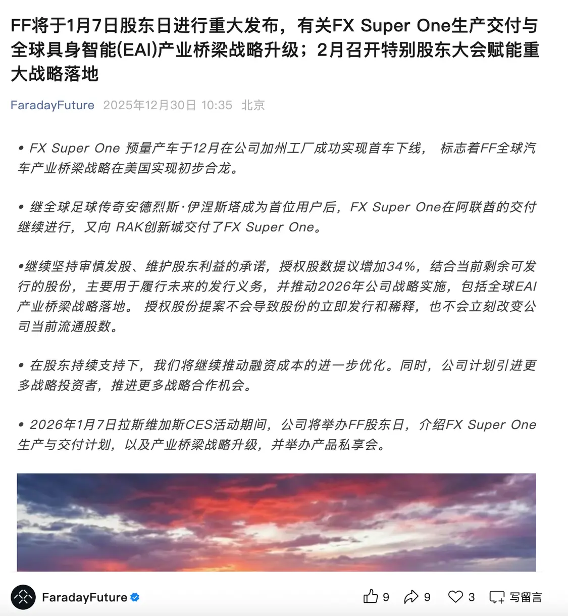 12月30日,法拉第未来(NASDAQ: FFAI)宣布,将于2026年2月13日召开特别股东大会。公司呼吁股东对所有提案投赞成票。股份授权提案方面,公司寻求股东批准对公司章程的修订,将普通股的授权股数量增加79,814,454股至312,285,439股;将公司优先股的授权股份数量的授权股数量增加6,156,265股至24,087,265股,使公司普通股和优先股的总授权股份从250,401,985股增加到336,372,704股,增幅约34%。
