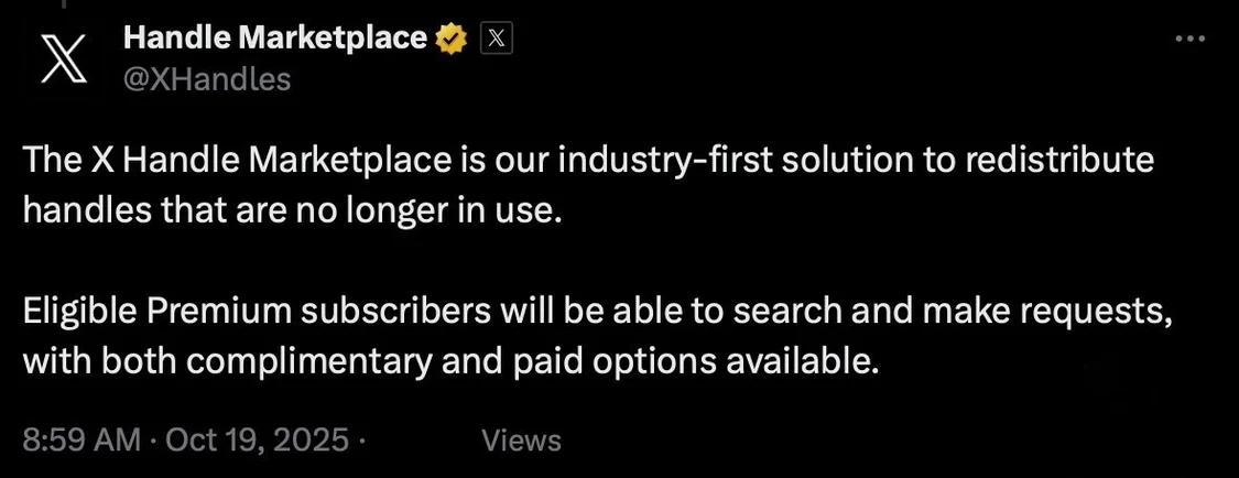 10 月 20 日消息,X 平台宣布为 Premium Plus 和 Premium Business 订阅会员用户推出全新的“靓号用户名交易市场(Handle Marketplace)”,允许相应会员支付一定价格,申请获得平台上被他人“长期未使用...