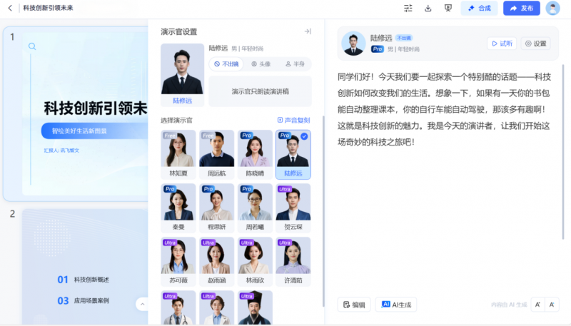 该功能支持用户上传任意PPT文件,系统即可智能生成演讲稿,并允许用户从15个不同职业风格的AI数字形象中选择“代言人”。更值得一提的是,通过声音复刻技术,用户可以一键生成自己的声音。只需点击合成,即可输出口型精准、音画同步的讲解视频。这一功能极大地降低了视频内容的制作成本,让专业表达不再受限于主讲人的时间与状态,实现了观点的标准化、自动化传播。