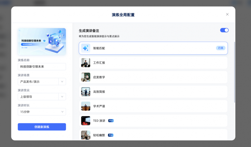 AI定思路,备稿不慌: 系统能根据24种演讲场景、10类受众群体及10大演讲风格,智能生成匹配的演讲备注,帮助用户精准抓住听众注意力。