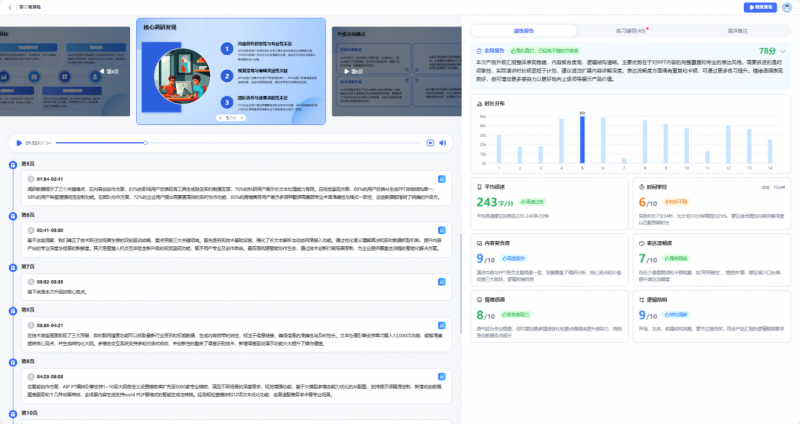 AI给反馈,科学提升: 每次演练结束,系统会自动生成全局分析报告,从平均语速、时间掌控、内容契合度等维度进行评分,并提供逐页的改进建议,帮助用户针对性强化表达弱点。