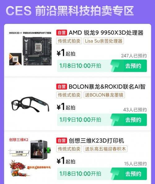 针对多款最具代表性的展会新品,京东还推出了「CES 全球新品 1 元起拍」活动,涵盖智能眼镜、3D 打印设备及处理器等多个品类,均可在京东拍卖 1 元起拍。创想三维 K2 3D 打印机搭配稀缺款乐高、AMD 锐龙 9 9950X3D 处理器(LISA SU 签名款)、暴龙与 Rokid 联名款 AI 智能眼镜等稀缺尖货均将于 1 月 8 日 10 点起陆续开拍。